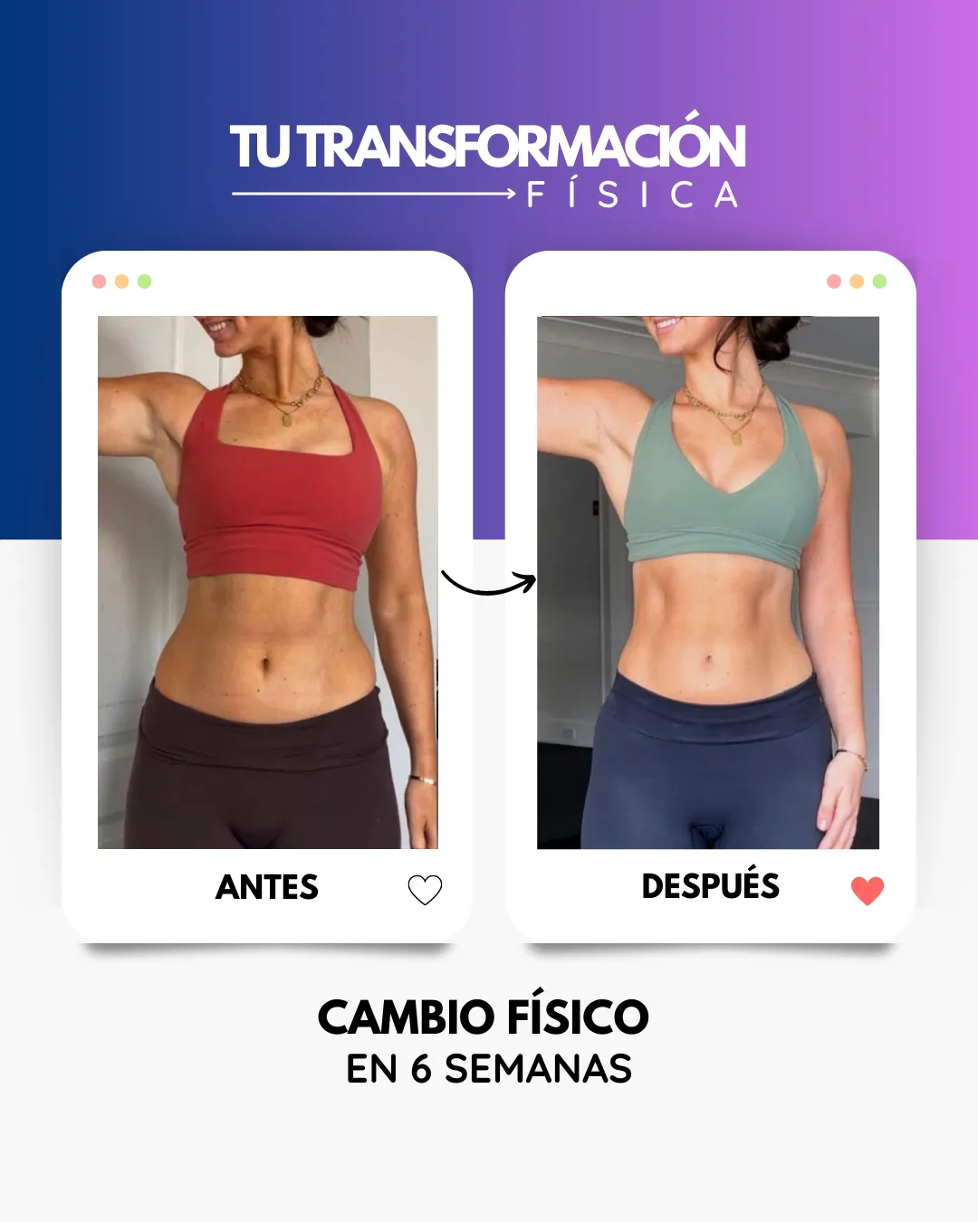Ayudamos a MUJERES que sienten que han perdido su forma física y por tanto su estado de salud no es el ideal, a conseguir sus resultados físicos y unos hábitos saludables en tan solo 6 semanas
